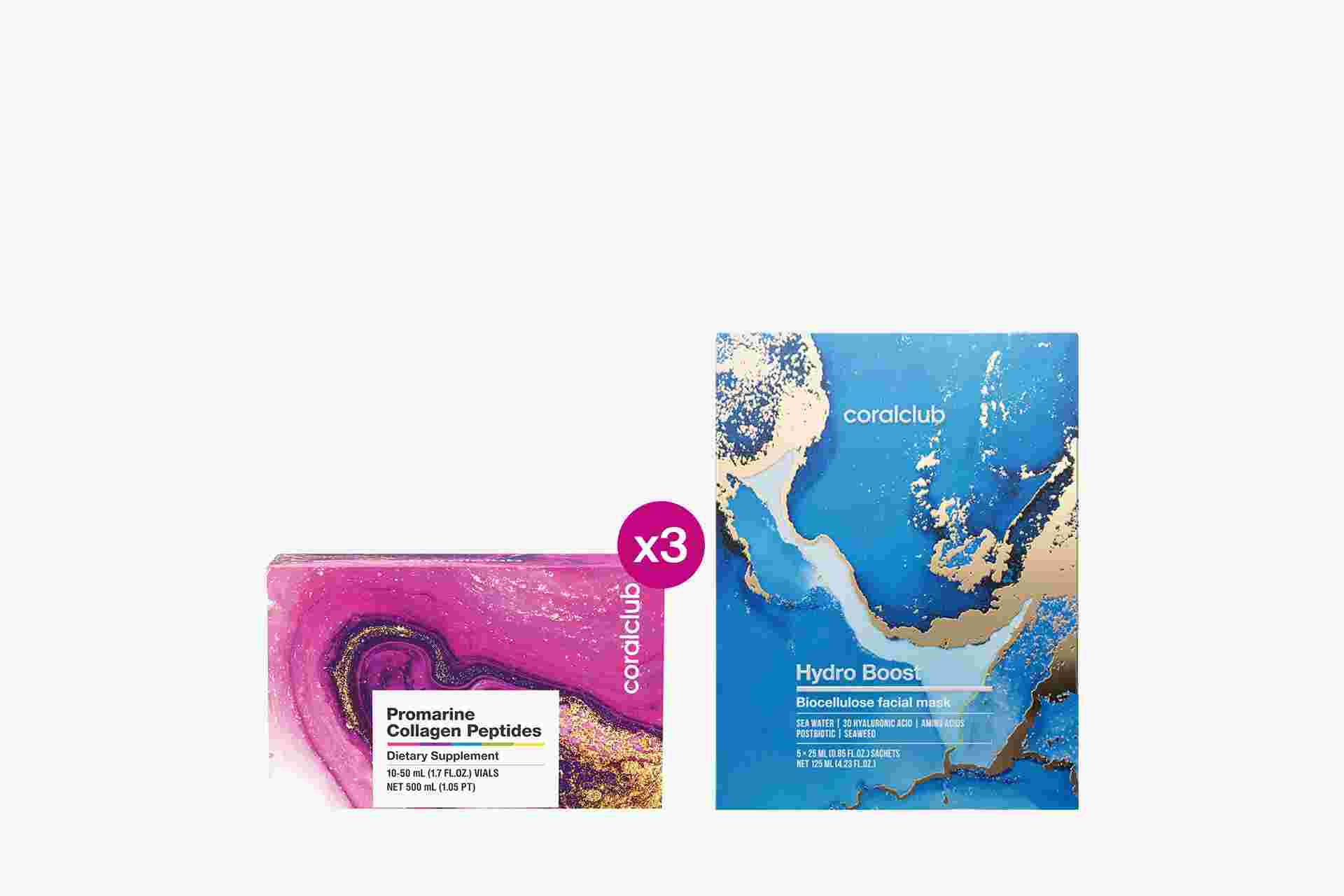 Set Promarine Collagen Peptides (cură de 1 lună) și măști faciale din bioceluloză Hydro Boost (5 bucăți)
