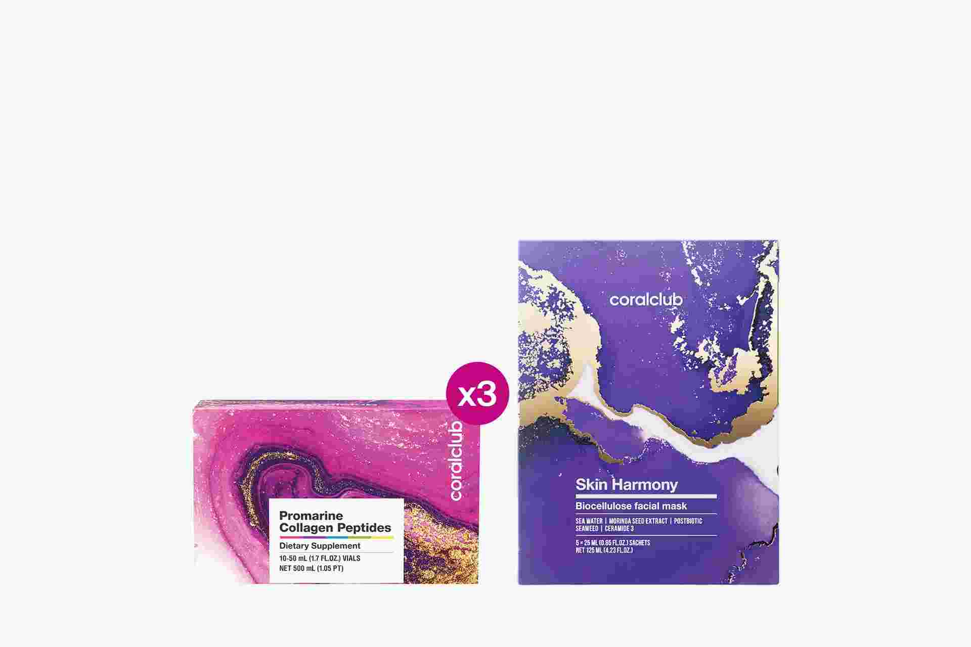 Set Promarine Collagen Peptides (cură de 1 lună) și măști faciale din bioceluloză Skin Harmony (5 bucăți)